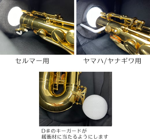 ① ネックを外した状態のサックスをケースにセットします。次に、譜面台取り付け穴(ライヤー)にケースの支持金具の突起部分を差し込み、ネジで固定します(セルマータイプ用、ヤマハ/ヤナギサワ用があります。画像参照)。